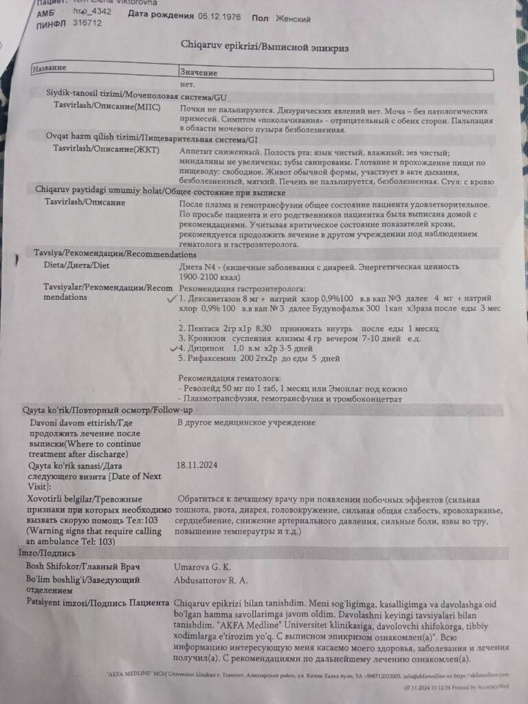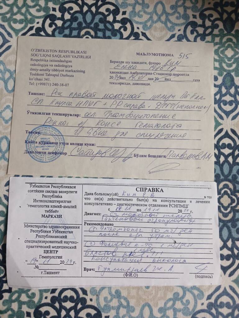 17 ноября, выписавшись из медучреждения с рекомендациями от врача, Елена и её племянница Алина с маленьким ребёнком на руках отправились за советом к другим специалистам-проктологам Ташкента, которые в один голос твердили: назначение врача AKFA MEDLINE хорошее, госпитализация больной не требуется. Однако, несмотря на прием препаратов, при выписке у Елены показатели тромбоцитов упали до 11 при норме в 150-180.